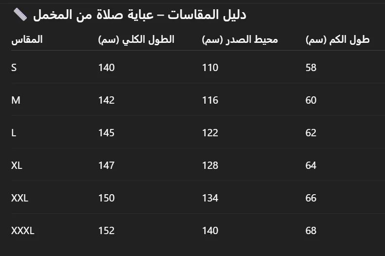 - عباية صلاة مصنوعة من قماش المخمل (موبرا) من الدرجة الأولى، مصممة خصيصًا لتوفير أقصى درجات الراحة والاحتشام أثناء الصلاة. تتميز بقماش دافئ وناعم، مثالي لفترة رمضان والأجواء الباردة، مع تصميم عملي يساعد على الخشوع والطمأنينة.